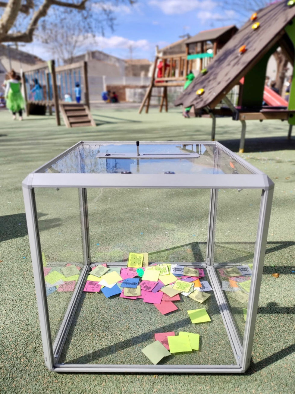 Fresque sur le mur de la cour de récréation de l'école maternelle de Lansargues. Réalisée en partie par les enfants lors d'ateliers peinture au rouleau, réalisation de totebags en ateliers également et finition de la fresque par nos artistes.